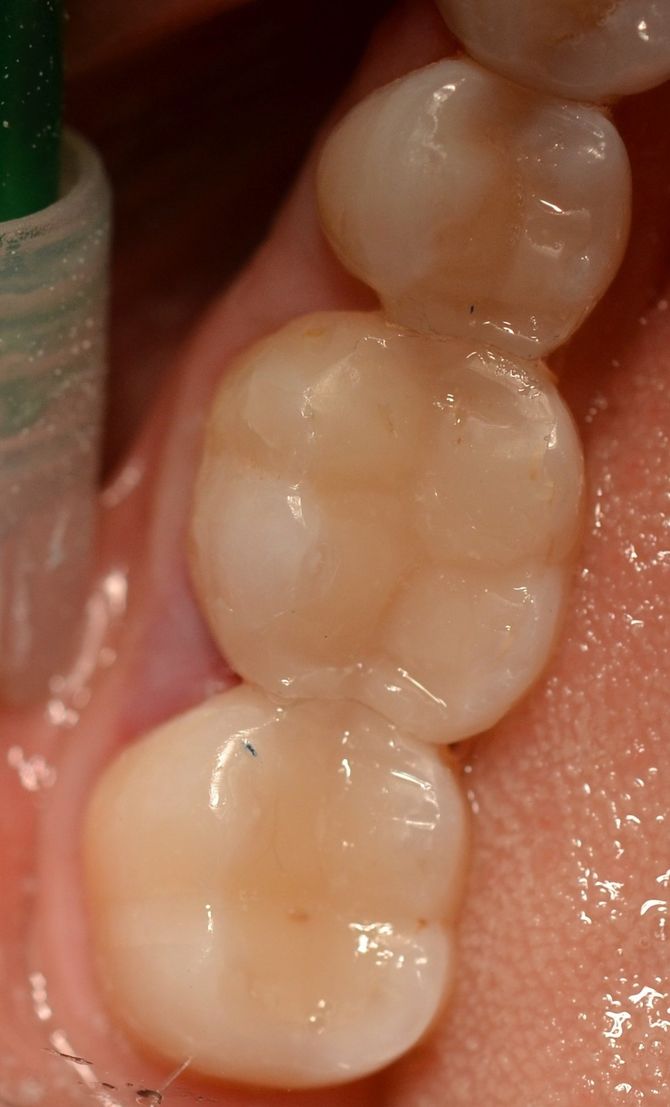 Viene presentato un caso in cui si evidenzia la presenza di carie mesiale e distale su un 25 (secondo premolare superiore di destra) attraverso l'analisi radiografica. Si deve sottolineare la difficoltà di metterne in risalto e di determinarne l'estensione solo mediante la radiografia. Nella fotografia successiva, l'entità e l'estensione della carie appaiono notevolmente superiori a quanto potesse essere dedotto dalla sola radiografia. Si mostra poi la cavità ripulita dalla carie, evidenziando la perdita di tessuto dentale causata da essa. Infine, si presenta l'otturazione appena completata, con i segni della cartina da articolazione ancora visibili, utilizzata per verificare l'altezza della cura, che richiederà successivamente un ulteriore rifinitura e lucidatura.